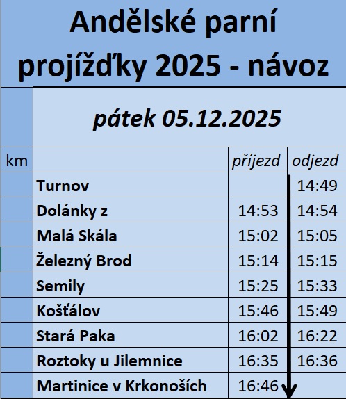 Pro zájemce bude možné cestovat i v pátek 5. 12. 2025 z Turnova, odkud do Martinic parní vlak přijede.