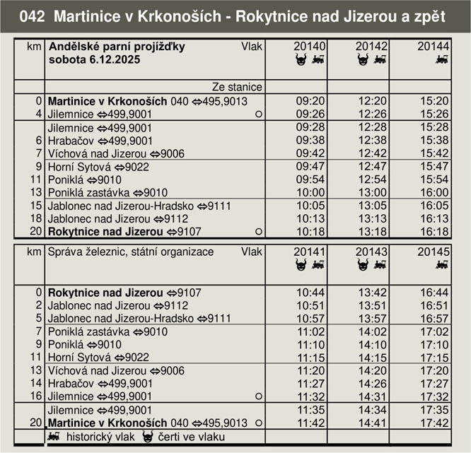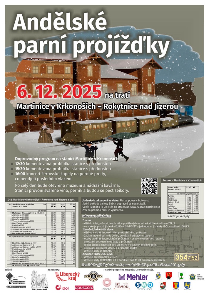 Spolek železniční historie Martinice v Krkonoších ve spolupráci s Libereckým krajem, společností Zubačka provoz s.r.o., KHKD, obcemi na lokálce, manželi Šírovými, společnostmi Mehler, Dva prameny, SWOTooling, sv. Mikulášem, archandělem Petronelem a Luciferem jsme pro Vás na sobotu 6. 12. 2025 připravili dvě vyjížďky v doprovodu Mikulášovi andělsko-čertovské družiny a kapely. Každý dětský cestující obdrží od Mikuláše drobný dárek. Třetí vyjížďka již bude jen pro cestující bez doprovodu sváteční družiny